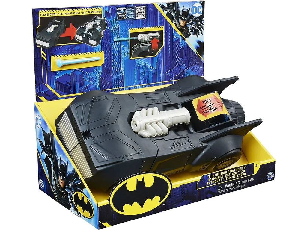Incluye: Una caja de almacenaje ilustrada, un Batmobil transformable en lanzador de misiles y un misil.