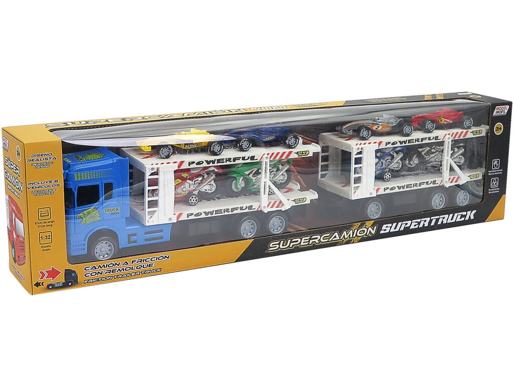 El Camión Fricción con doble remolque, transporta 4 coches de fórmula uno y 4 motos con los que poder hacer carreras o aquello que se le pase por la cabeza al niño. Las motos tienes unas pequeñas ruedas para darle estabilidad. Con una escala de 1:32, cuando arrastras el camión , gracias a la fricción, coge velocidad.