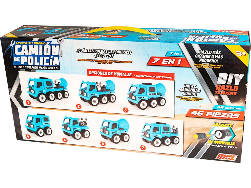Incluye: 1 camión de policía montable ampliable 7 en 1 y 1 destornillador para el montaje del vehículo.