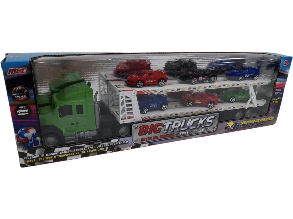 Incluye: 1 camión portacoches de color verde con sistema de fricción y 6 coches de competición.