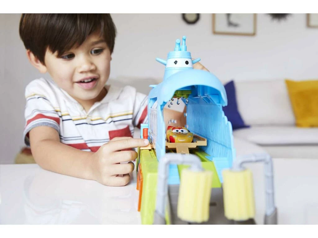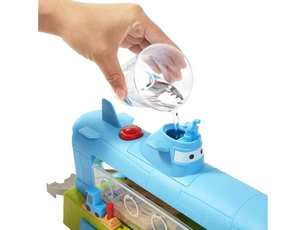 Incluye: 1 vehículo Rayo McQueen Color Changes y 1 playset Submarino de Autolavado con zona de lavado, zona de secado y cajones para agua caliente y agua fría.