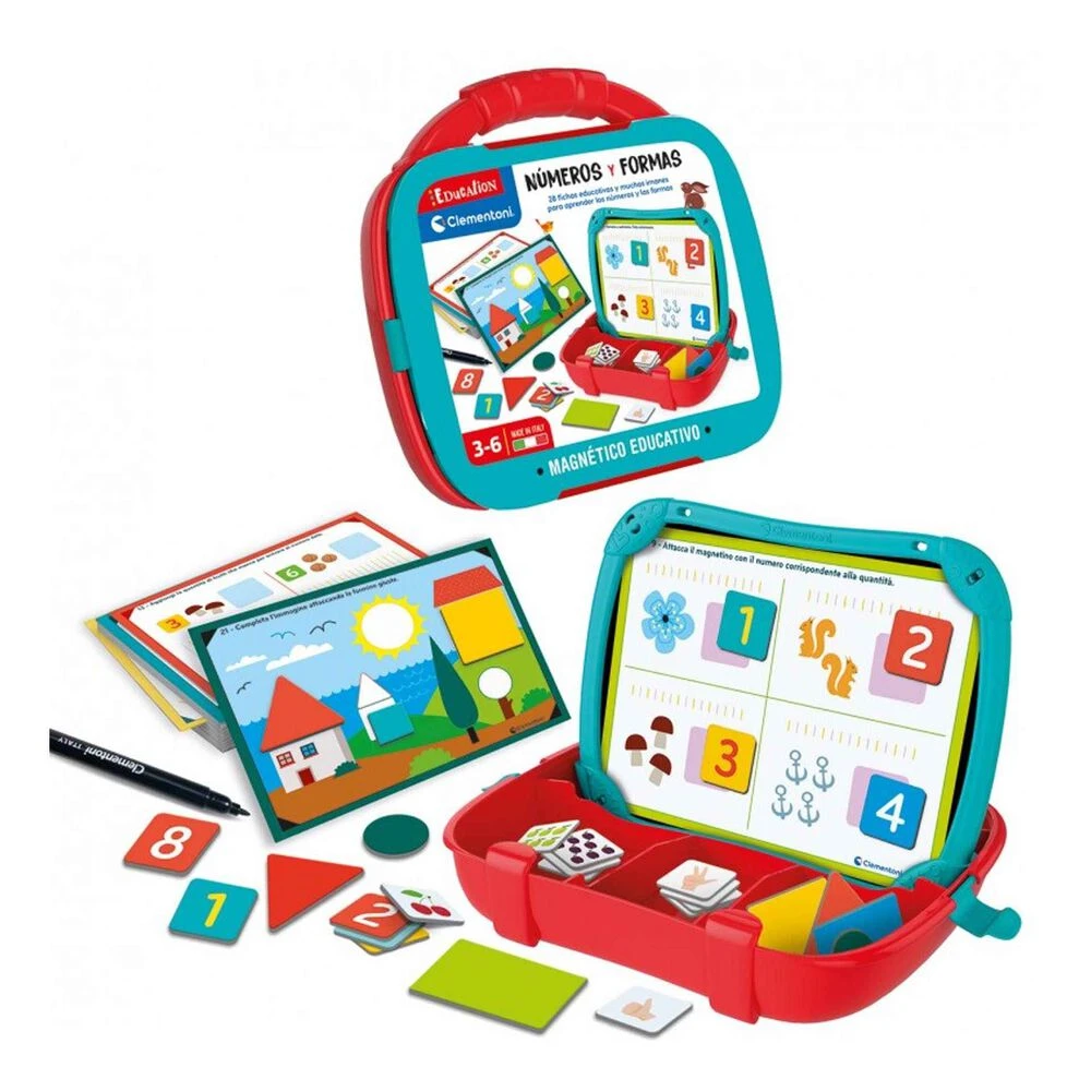 Todo lo que necesitas para prepararte para ir a la escuela primaria en este práctico maletín que podrás llevar siempre contigo. En esta versión, los números y las formas se presentan a través de muchos imanes de colores. Además, la pizarra a la que se adhieren los imanes tiene una cara en la que se puede escribir con el rotulador indeleble incluido. ADVERTENCIA: No recomendable para menores de 3 años, ya que contiene piezas pequeñas que podrían provocar asfixia en caso de ser ingeridas por el niño/a.
