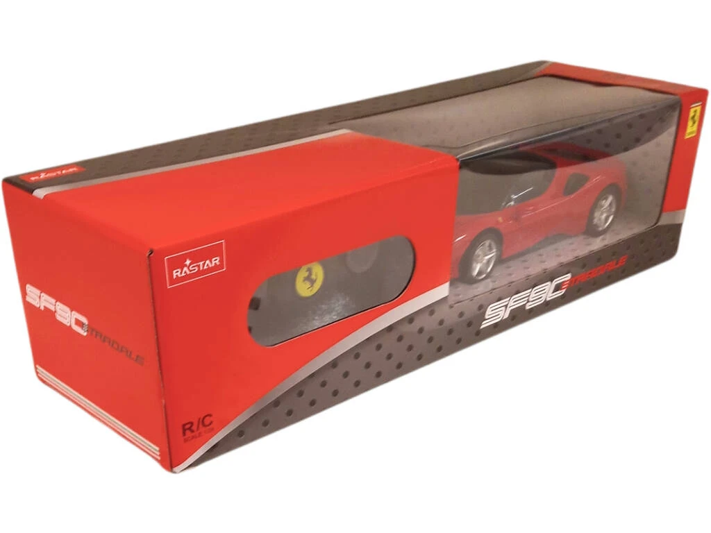 Incluye: Una caja de almacenaje ilustrada, un Ferrari SF90, un mando radio control y una guía de instrucciones.
