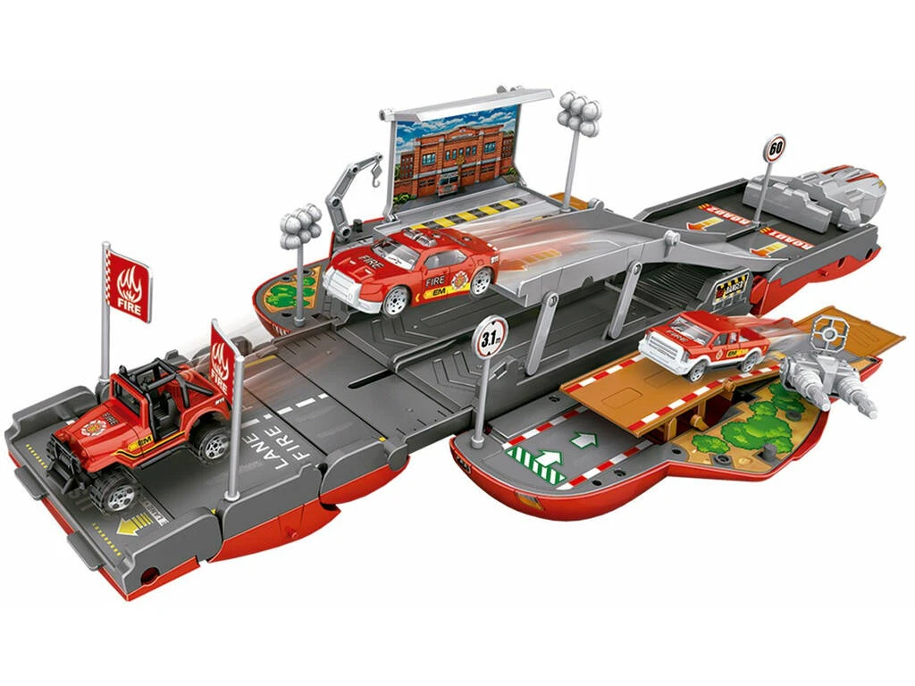 Consigue este fantástico coche de juguete, transformable en pista de bomberos llena de espacios de juego para tus coches de juguete. Un 2 en 1 genial, que se abre con facilidad y de ese modo disfrutar de un nuevo espacio de juegos para tus coches a escala.