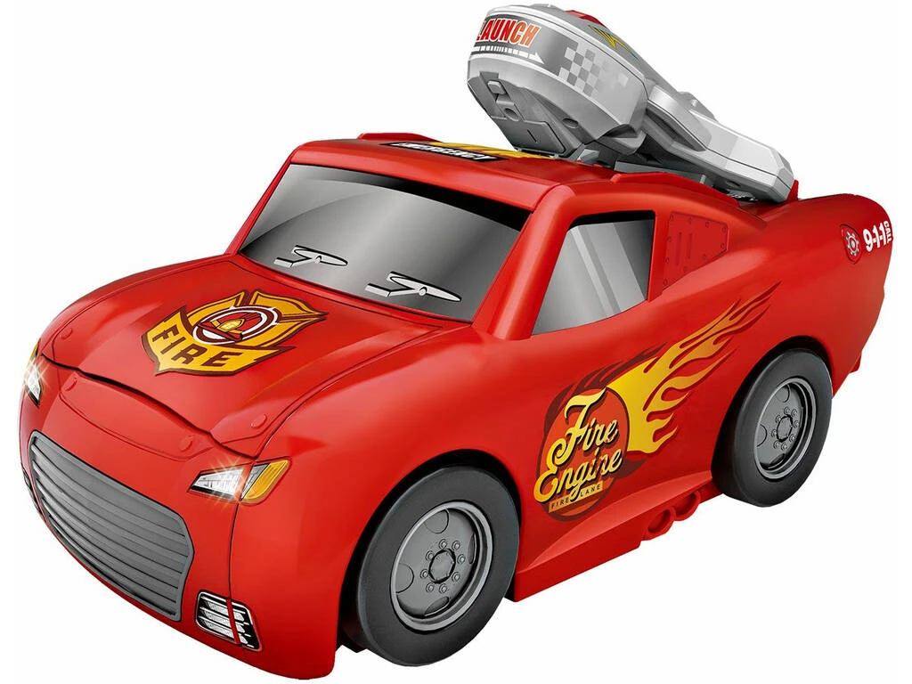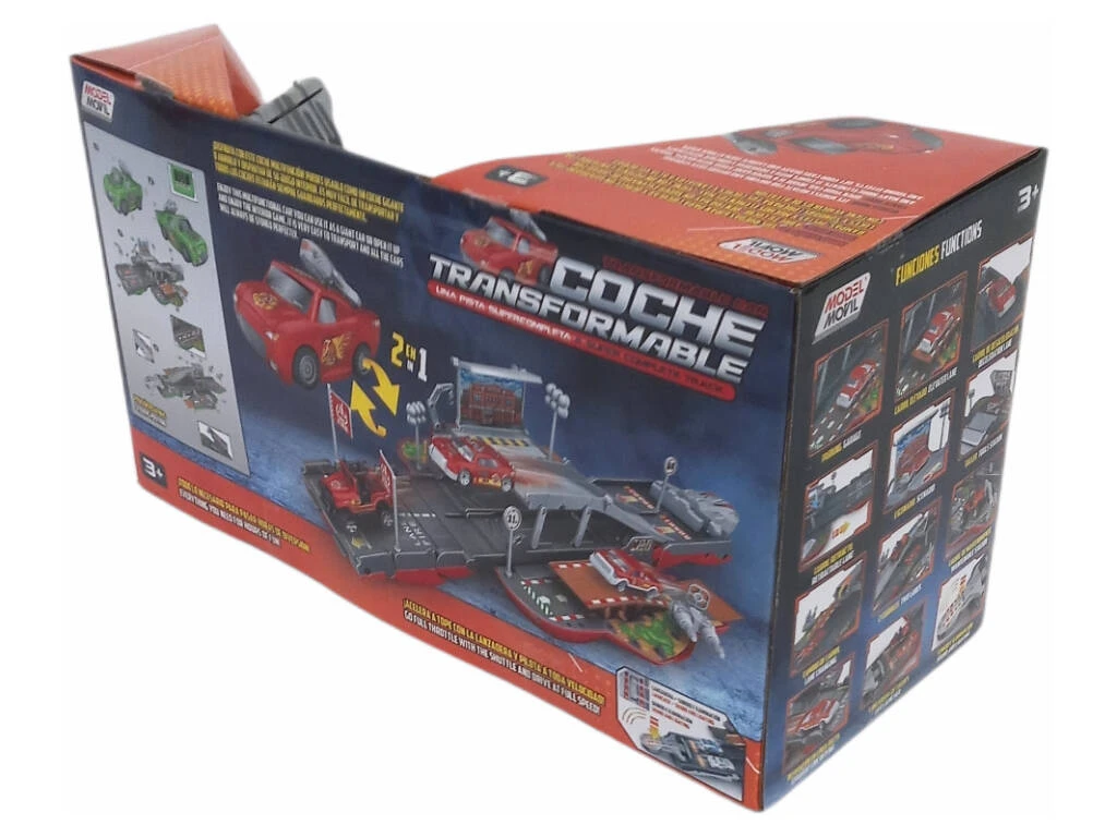 Incluye: 1 lanzador de coches con luz y sonidos, 1 coche de color rojo transformable en pista de bomberos con parking, carril elevado, carril de desaceleración, carril retráctil, escenario, taller, cambio de carril, 2 carriles, carril de mantenimiento y desviación en linea recta.