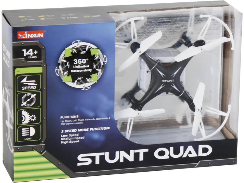 ¡Sobrevuela el aburrimiento junto a un vehículo sin igual! ¡Consigue el nuevo y potente Dron Stunt Quad Negro 2.4GHz!