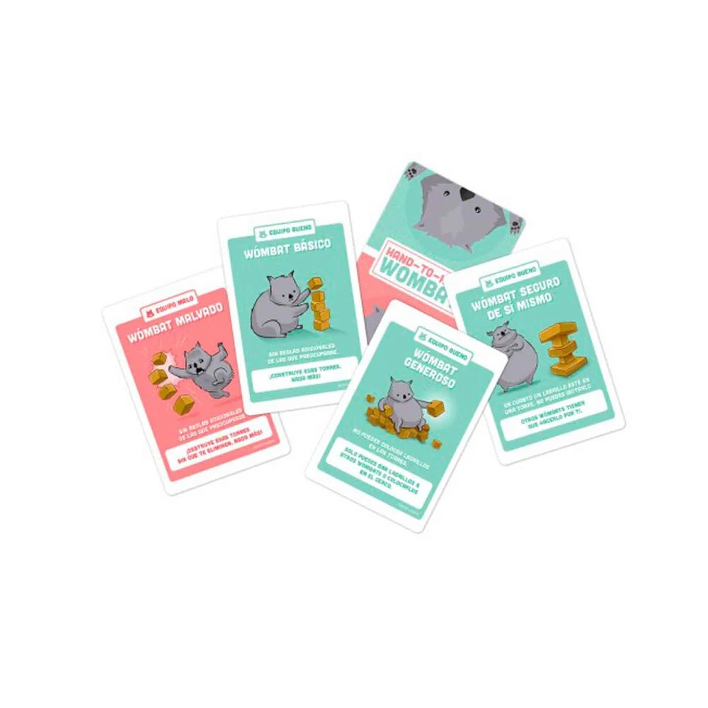 Hand to Hand Wombat es un juego de cartas de trabajo en equipo, torres y alborotadores. ¿Podréis tú y tu equipo construir tres torres antes de que el otro equipo las destruya? ¿Podréis hacer todo eso con los ojos cerrados?