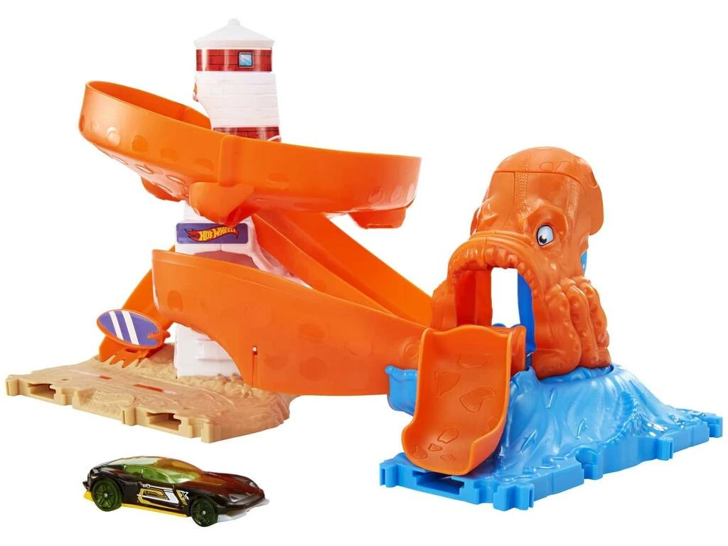 Incluye: 1 vehículo Hot Wheels de color morado y amarillo y 1 playset Ataque de Invasión del Pulpo con giros, rampas y más zonas de juego.