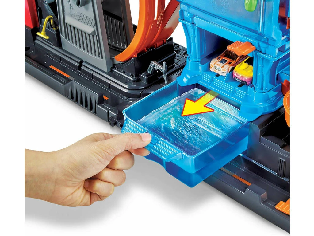 Prepárate para visitar uno de los lavaderos más peligrosos y sorprendentes de la ciudad, lleva tus Hot Wheels Color Reveal al lavadero y reta al imponente pulpo. En el playset tienes zonas de aparcamiento, rampas, zonas de lavado que pueden hacer cambiar de color tus Hot Wheels Color Reveal, un looping y mucho más. ¡Todo lo que necesitas para horas y horas de diversión en el clásico tamaño de los Hot Wheels!