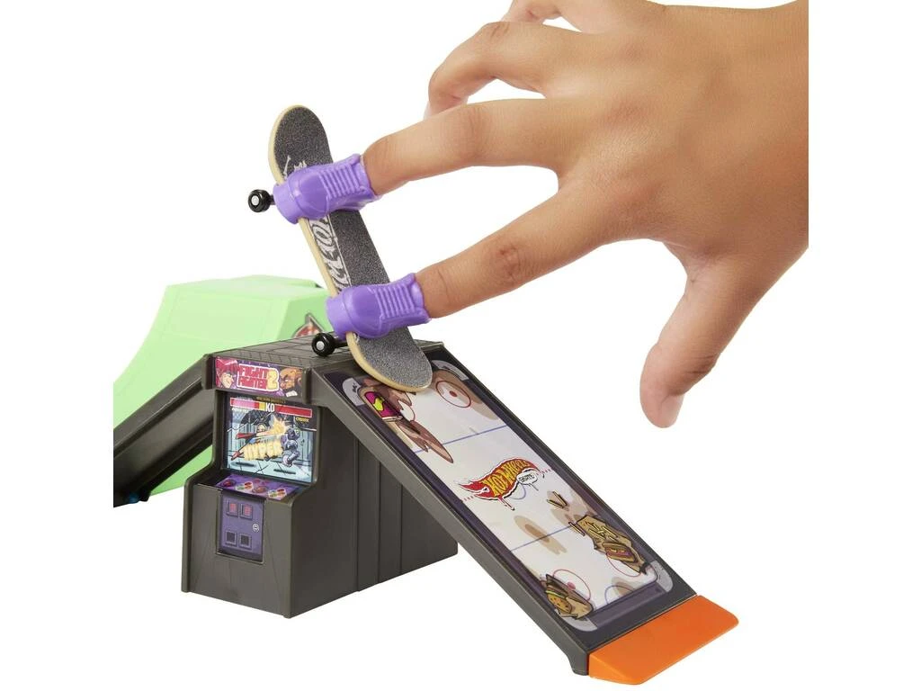 Incluye: 1 skate Tony Hawk de Hot Wheels Skate, 1 pare de deportivas para los dedos y 1 playset especial con diferentes zonas de juego.
