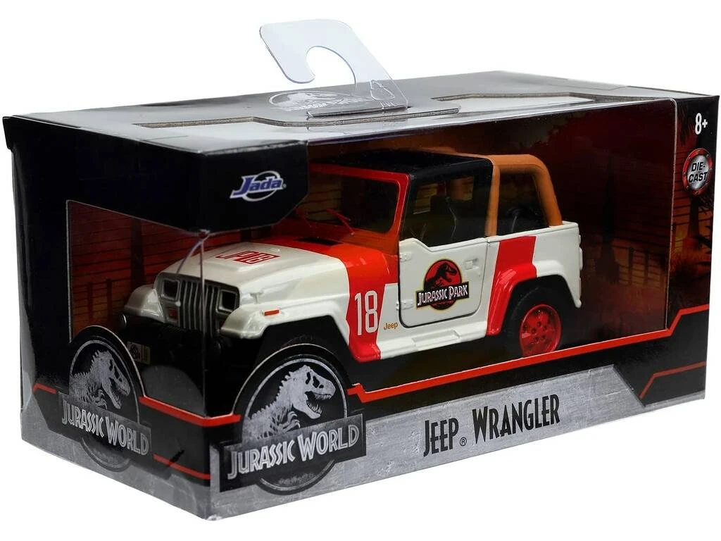 Incluye: 1 vehículo Die-Cast Jeep Wrangler de color blanco y rojo con numeración 18 de Jurassic Pack.