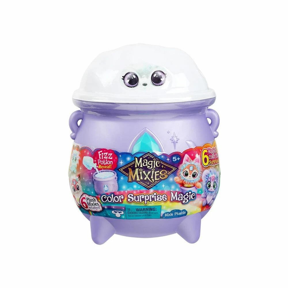 ¡La magia sigue en el mundo de Magic Mixies ahora con el MagiColour Surprise! Un nuevo caldero lleno de magia y con seis Mixies diferentes para coleccionar. ¡Es hora de jugar con el Mixies! Tiene seis sorpresas que tendrán que ir descubriendo poco a poco. La varita al sumergirla en agua cambia de color, cuando viertan agua en la gema descubrirán cuál de las seis les ha tocado. Al darle calor a su marca de nacimiento, verán que cambia de color. Pero esto no es todo, la colita también cambia de color cuando le dan calor. Este set incluye un mini caldero, un Mixies, una varita, dos sobres de polvos y uno con un pergamino, un libro de instrucciones, un frasco y un tapón.