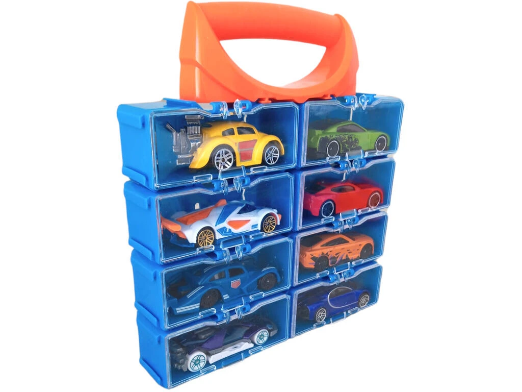 Incluye: 1 maletín con 8 espacios para vehículos con ventana transparente, sistema para clavarlos en la pared y asa de transporte y 8 coches a escala 1:64 con diseños variados.