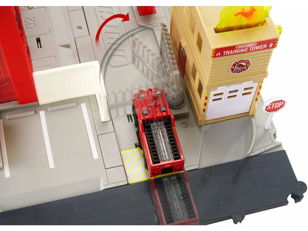 Incluye: 1 playset Matchbox Action Drivers Estación de Bomberos con luces y sonidos y 1 vehículo Camión de Bomberos Blaze Blitzer.