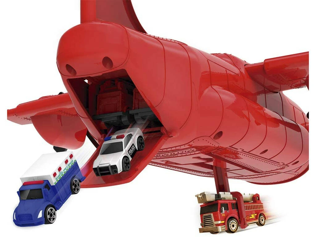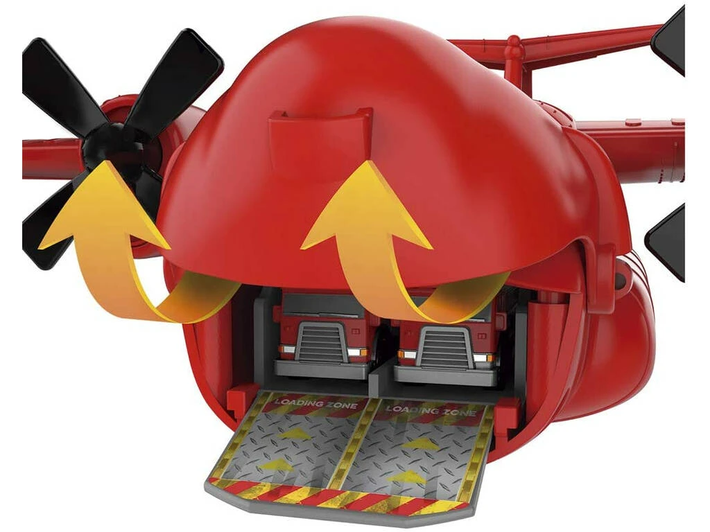 Descubre un avión de lo más impresionante, capaz de transportar hasta 20 vehículo Micromachines de forma ordenada. Coloca 12 de tus Micromachines en la parte superior y los otros 10 en la parte inferior, y lleva tus mini vehículos a la zona de juegos y competición. ¡El avión tiene hélices que giran de verdad, compuerta de tren de aterrizaje, gancho de rescate y mucho más!