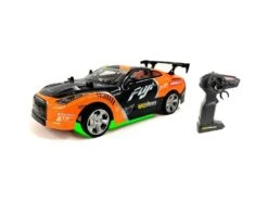 Incluye: 1 vehículo RC Fuji de color naranja y negro con luz LED y 1 control remoto con tecnología 2,4 GHz libre de interferencias.