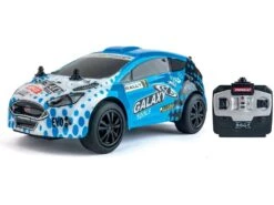 Incluye: 1 vehículo RC X-Rally Galaxy de color azul, blanco y negro y 1 control remoto con tecnología 2,4 GHz libre de interferencias.