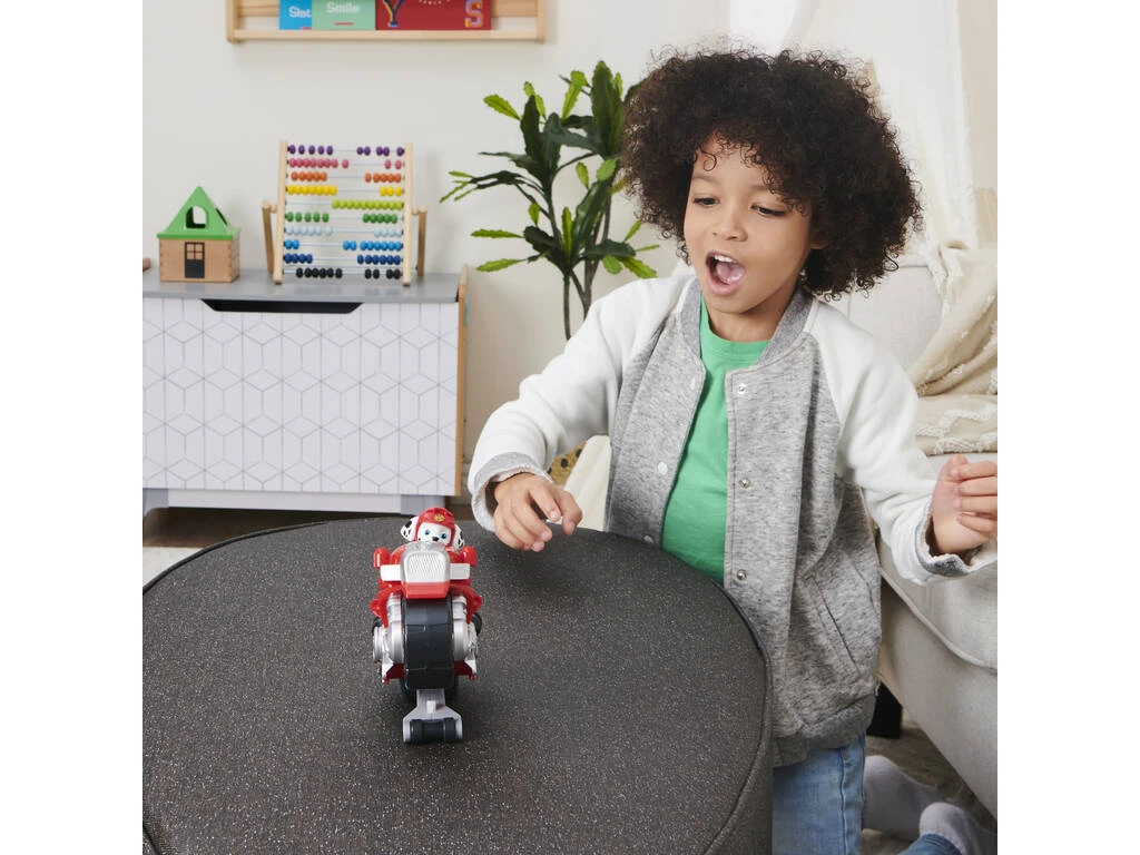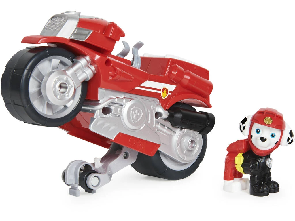 Incluye: 1 figura de acción Marshall con cabeza articulada y 1 moto deluxe de color roja y blanca con espacio para la figura y rueda especial para trucos.