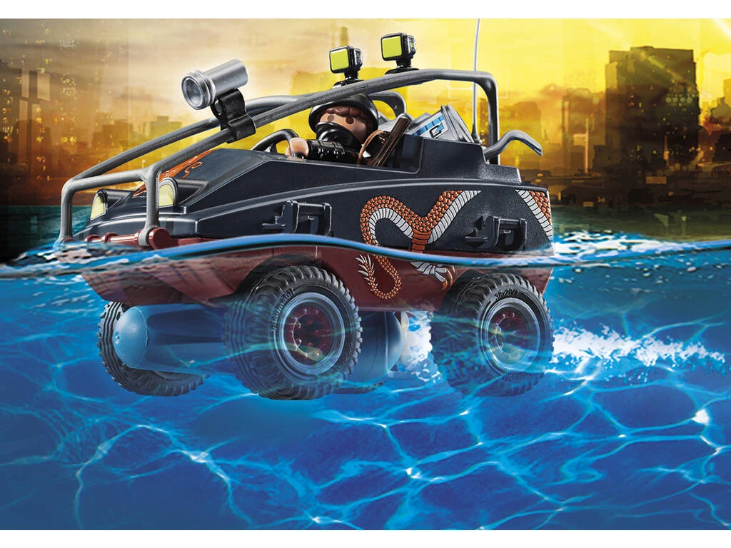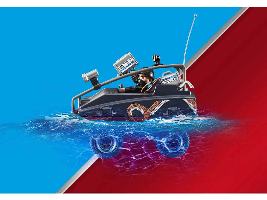 ¡Por tierra, mar y aire, nadie escapa de la justicia! ¡Pásalo en grande gracias al nuevo set Playmobil Policía Paracaídas Persecución del Vehículo Anfibio!