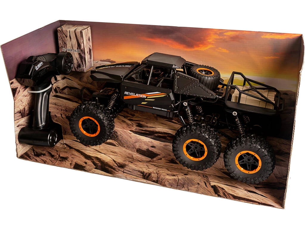 Incluye: 1 vehículo radio control High Crawler Revelation 6 Ruedas de color negro, 1 control remoto, 1 batería 6V y 1 cable cargador USB.