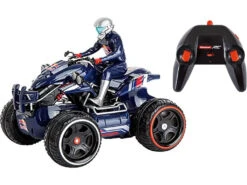 Incluye: 1 quad RC Red Bull Amphibious Quadbike de color azul con piloto, 1 control remoto con tecnología 2,4 GHz, 1 batería LiFePO4 de 6.4V 700 mAh para el quad y 1 cable de carga USB para la batería.
