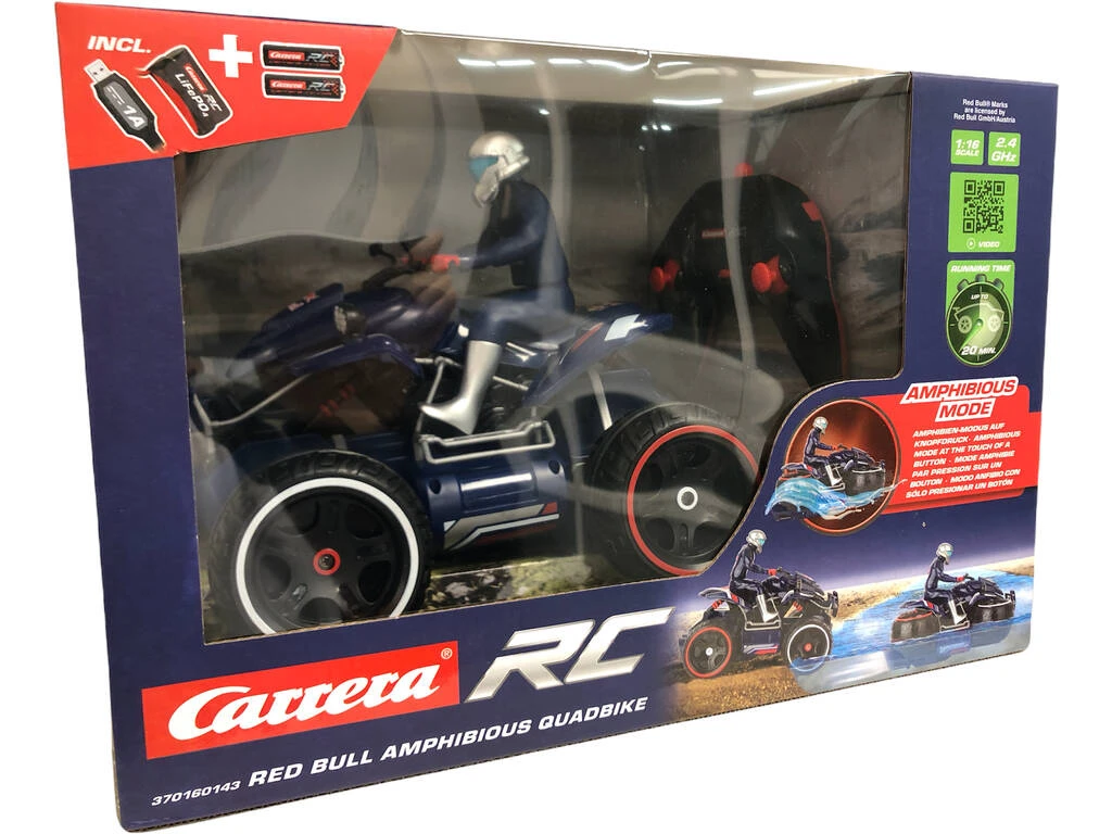 ¡Dos vehículos en uno, doble diversión! ¡Con el nuevo vehículo Radio Control 1:16 Red Bull Amphibious Quadbike de Carrera!