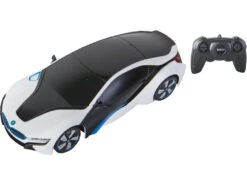 Incluye: 1 vehículo RC BMW i8 UV Sensitive Collection de color blanco y negro y 1 control remoto con tecnología 2,4 GHz.