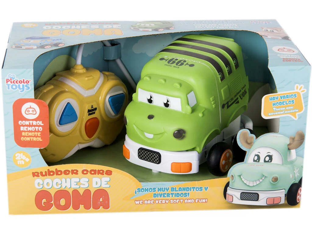 El camión de basura se separa de la base de plástico, blanca para evitar roturas, ya que dispone de un sistema anti-colisión. Un vehículo radiocontrol, que se maneja con un mando de plástico amarillo, y sencillos botones para facilitar el uso a los pequeños.