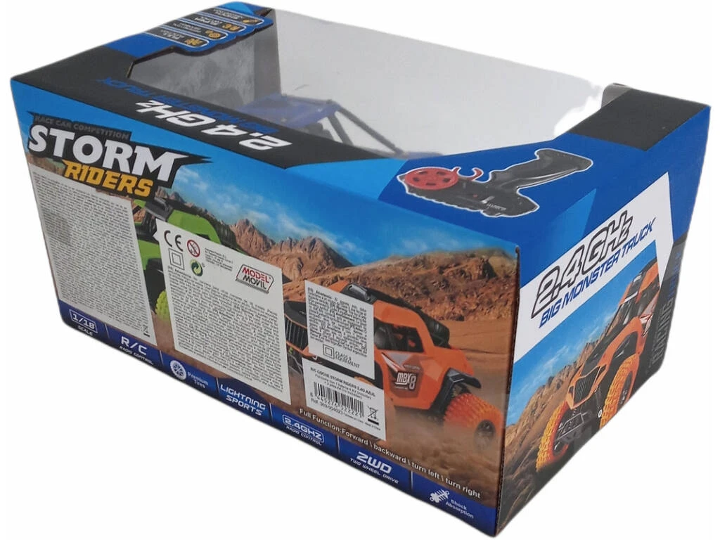 Incluye: Una caja de almacenaje ilustrada, un coche Storm Riders naranja, un mando radio control, una batería de 4.8V, un cable USB y un manual de instrucciones.
