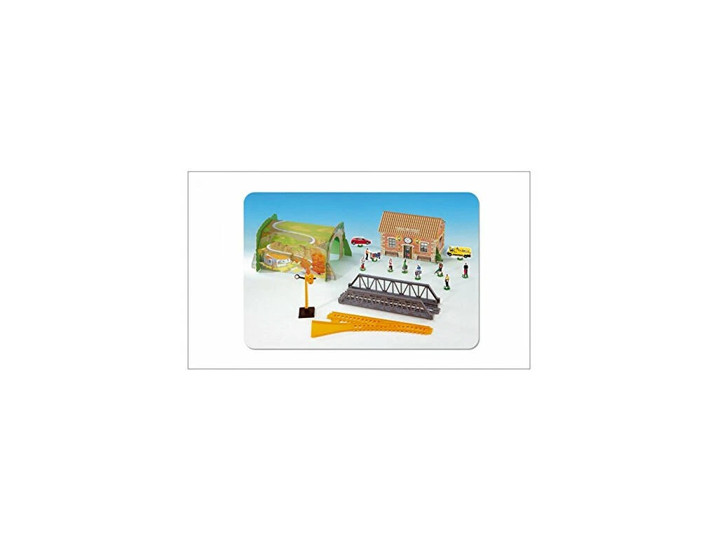 Incluye: 1 locomotora, 3 vagones, 12 vías curvas, 6 vías rectas, 1 encarrilador, 1 puente, 1 estación, 1 túnel, 1 semáforo, 1 lámina de personajes y 10 peanas de personajes.