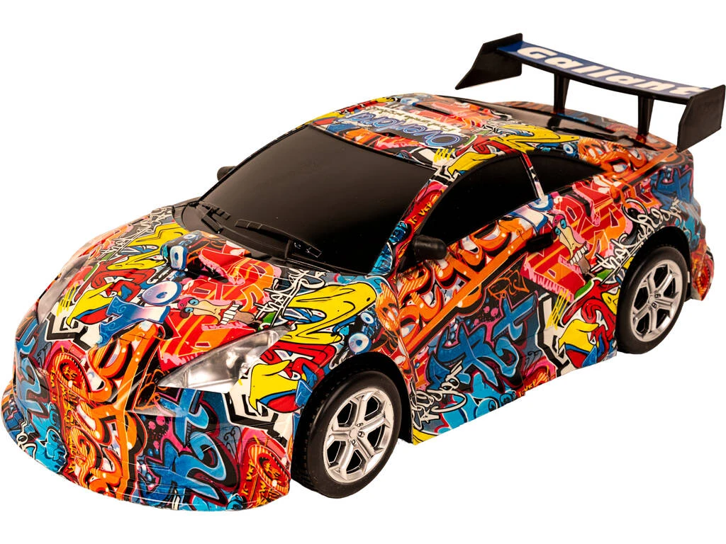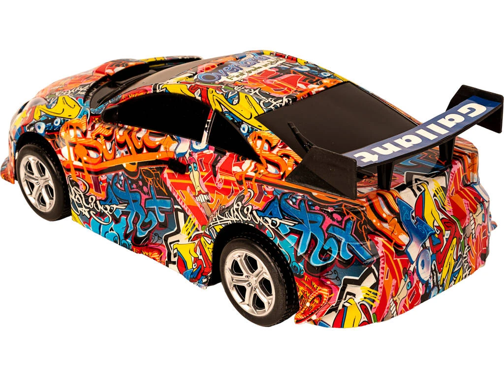 Hazte con este sorprendente vehículo de competición, con una increíble carrocería llena de graffitis a todo color y un sistema de fricción para facilitar su manejo sobre el sueño adaptado para el juego. Los pequeños conductores podrán recrear aventuras de lo más emocionantes junto a su nuevo vehículo de juguete, fabricado en plástico resistente y con un estilo imponente. ¡Gran tamaño para grandes aventuras sobre las cuatro ruedas!