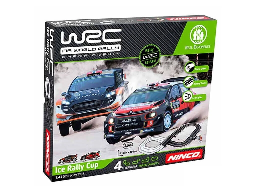 Incluye: 1 circuito World Rally Champinship Ice Rally Cup, 1 vehículo Citroën C3 WRC 2017, 1 vehículo Ford Fiesta WRC, 2 mandos de control para los vehículos y 1 conector 12V par ala luz.
